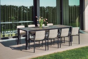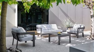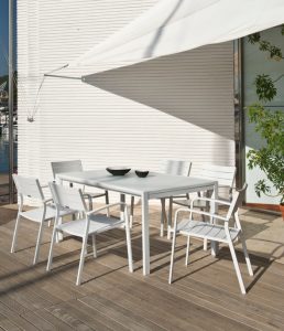 Podemos decir que el material protagonista en el mercado actual para el mobiliario de exterior es el aluminio. Podemos encontrar diseños minimalistas de líneas rectas y discretos volúmenes tanto en zona de sofás, sillones, mesas de comedor, etc. El aluminio lacado no requiere de ningún tipo de mantenimiento y es un material que permanece inalterable durante el paso del tiempo, soporta cualquier tipo de inclemencia sin sufrir ningún deterioro.